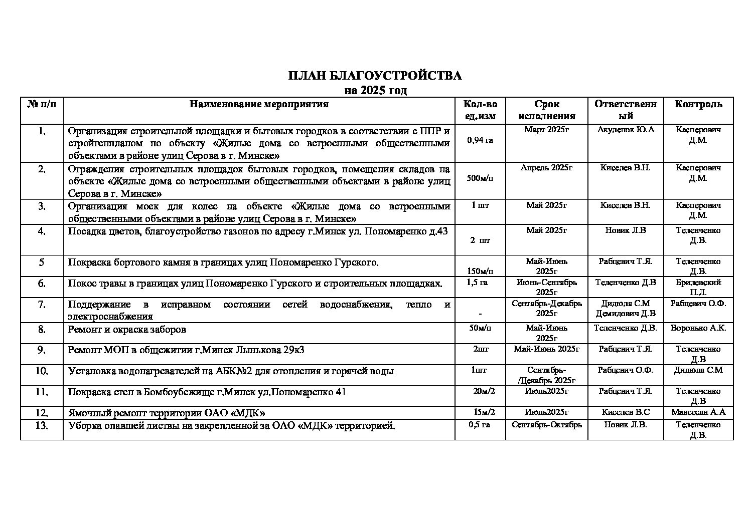В соответствии с Указом Президента Республики Беларусь от 03.01.2025г. №1 «Об объявлении 2025 года Годом благоустройства» руководством ОАО «Минский домостроительный комбинат» был разработан план мероприятий по благоустройству на 2025г.